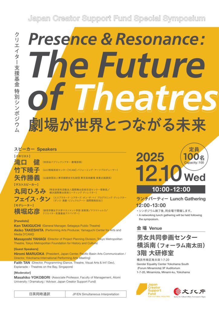 As part of the Japan Creator Support Fund’s “Support Program for Cultural Facilities Function Enhancement”, We will hold the Symposium” Presence & Resonance: The Future of Theatres ” at YPAM. Featuring special guest speakers with international expertise, participants will discuss how theatres can build global networks and highlight their potential as incubation platforms.