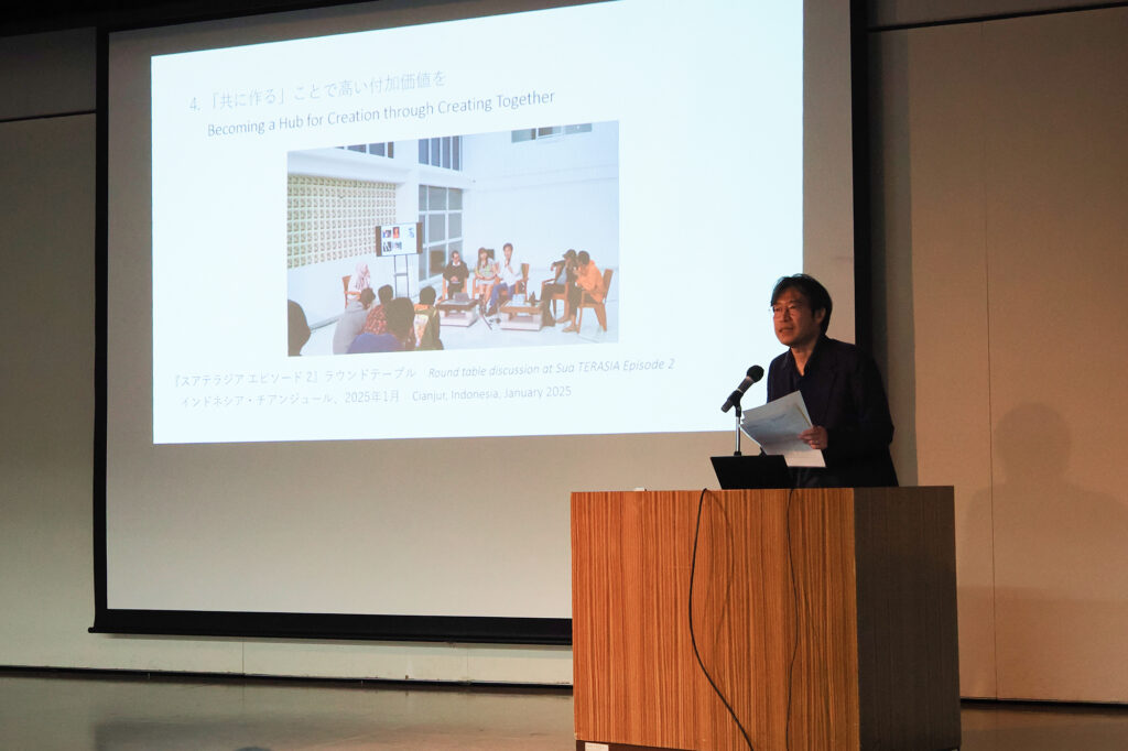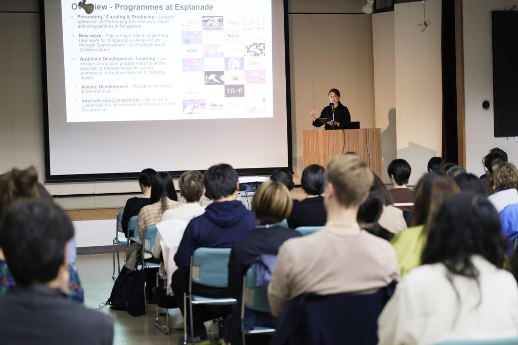 シンポジウム開催にあたり「クリエイター支援基金」や文化施設支援の概要説明を行った後、前半は、採択団体の中から3館の事業中核者と、シンガポール エスプラネード・シアターズ・オン・ザ・ベイ(以下、エスプラネード)のフェイス・タン氏による、事例発表を行いました。採択団体からは、3館の事例をご紹介いただき、フェイス・タン氏からはエスプラネードの人材育成や国際展開におけるプログラムについて発表いただきました。